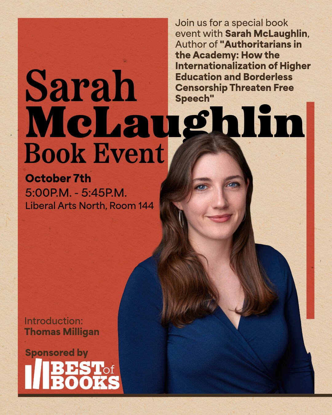 Join us for a special book event with Sarah McLaughlin, Author of "Authoritarians in the Academy: How the Internationalization of Higher Education and Borderless Censorship Threaten Free Speech"