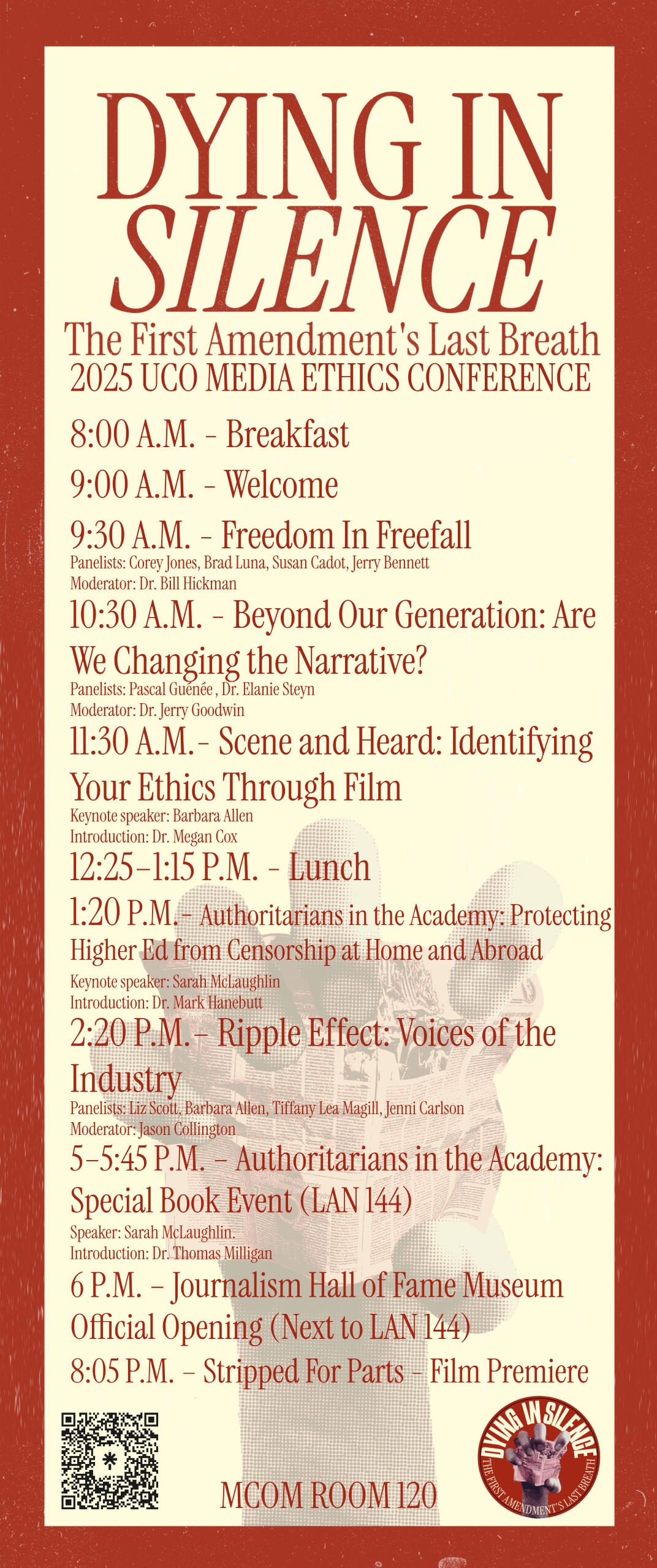 Starting on October 8th at 11:00 A.M. , Join us online and experience the 2025 UCO Media Ethics Conference in real time. The livestream gives you full access to keynote speakers, panel discussions, and conversations.